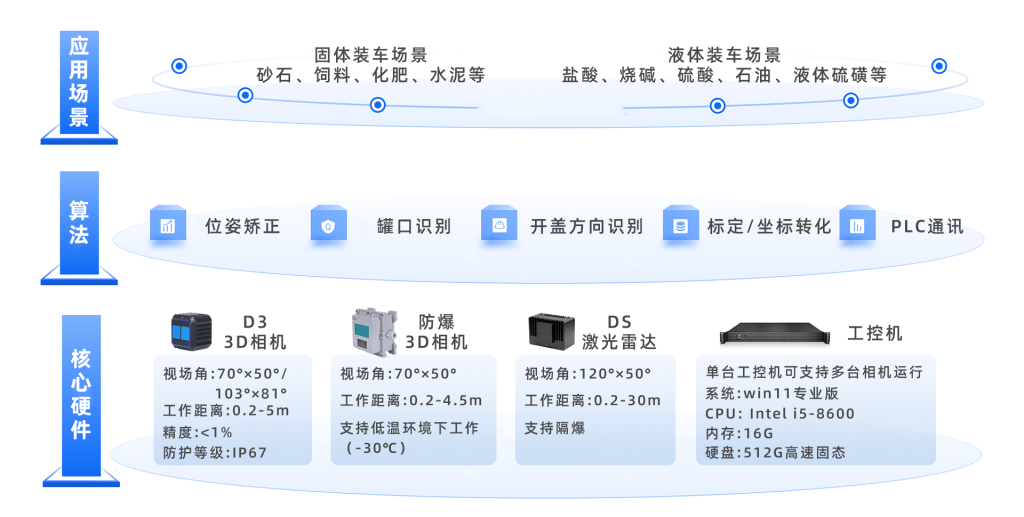 罐车装车场景面临诸多难题,粉尘、有毒气体危害工人健康,司机频繁变动、人员成本高也阻碍行业发展。为此,众多企业引入自动化设备技术来提升效率、降低成本。洛微ToF 相机具有毫米级测量精度且抗环境干扰小,能快速捕捉分析罐口的位置与形状,精准指导下料口与罐口对准,在煤炭、矿石等固体,盐酸、石油等液体装车罐口定位上都可灵活应用,助力实现自动化装车。